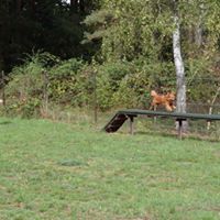 - Hürdenlauf: Vom Hund ist eine 50 Meter lange Strecke mit drei Hindernissen zu überwinden. Der Hundeführer läuft parallel zur Bahn und der Hund soll mit ihm auf gleicher Höhe bleiben. Das Reißen von Stangen, Vorprellen oder Zurückfallen des Hundes wird mit Punktabzug bestraft.